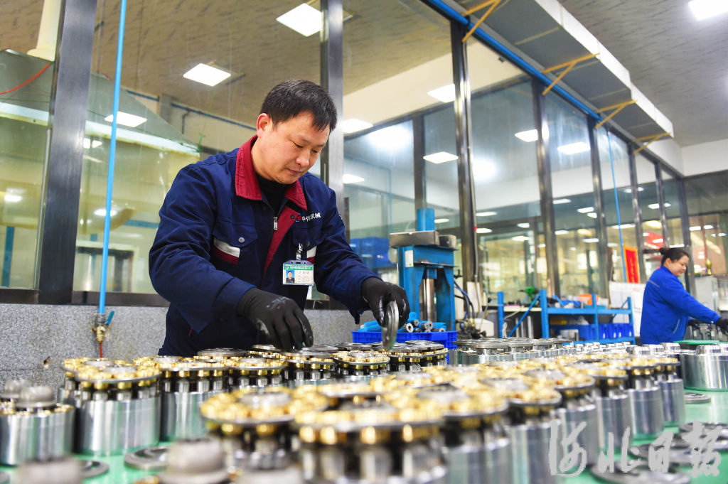 2月26日,邢台中伟卓特液压科技有限公司工人工人在组装挖掘机液压泵。