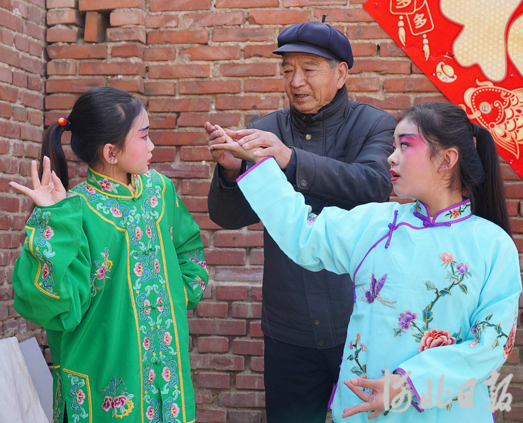 3月10日,河北省正定县曲阳桥镇后塔底村,91岁的后塔底村非传承人黄兰亭辅导当地小学生练习丝弦戏曲动作。