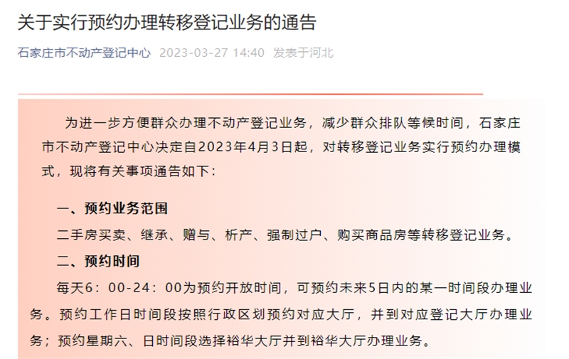 原标题:办理不动产转移登记须提前预约!石家庄4月3日起实行