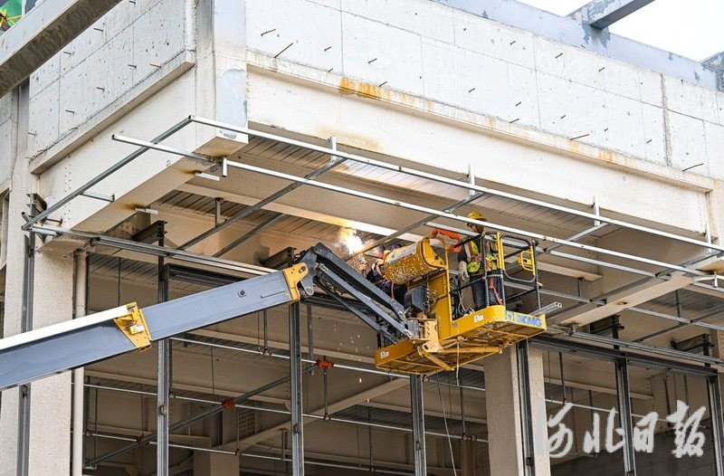 4月15日,施工人员正在对中国古动物馆的外墙装饰面进行焊接作业。