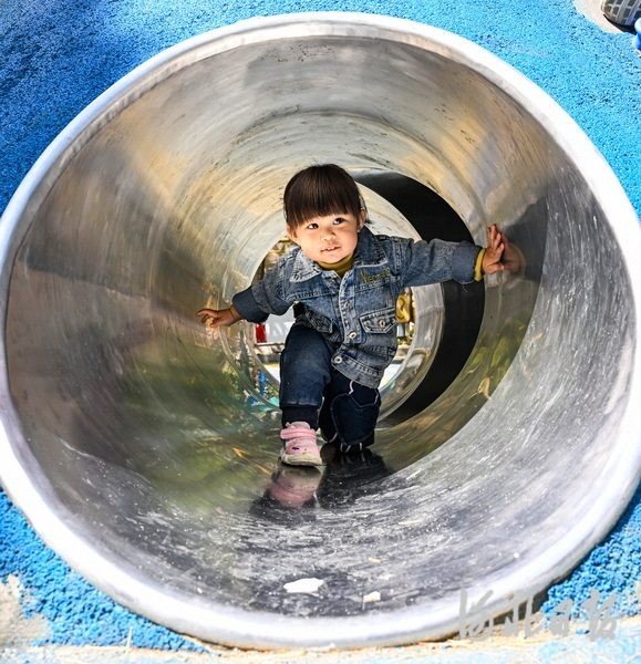 4月16日,一位小朋友在保定市竞秀区胜利南巷的“胜利·儿童友好街区”玩耍。