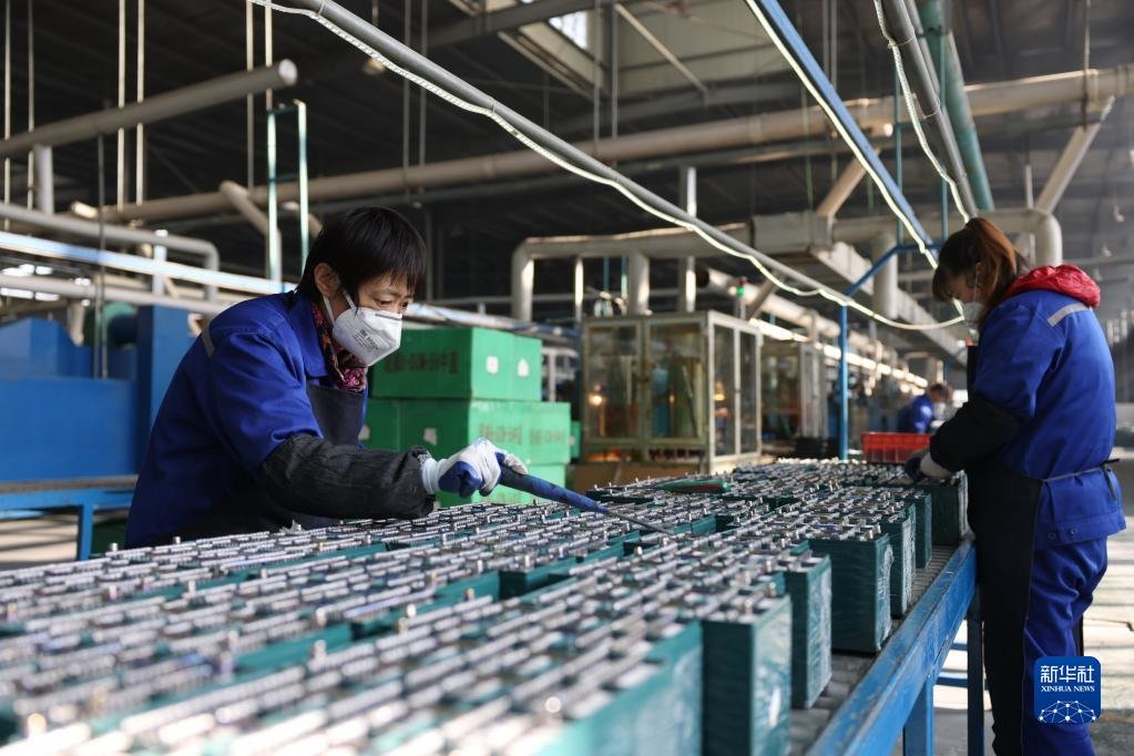在河北超威电源有限公司,工人们正在检测产品。新华社记者张玮华 摄