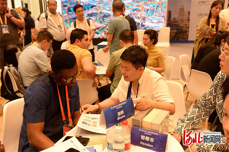 6月17日,中外客商在廊坊临空国际会展中心对接洽谈区洽谈交流。 河北日报记者 赵永辉摄