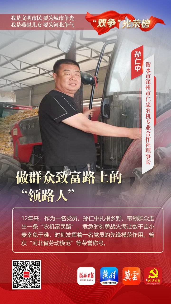 孙仁中,男,1970年7月生,中共党员,河北省衡水市深州市仁忠农机专业合作社理事长。12年来,作为一名党员,他扎根乡野,倾情服务,带领群众走出一条“农机富民路”。他免费为五保户、困难户提供农机服务,危急时刻勇战火海让数千亩小麦幸免于难,时刻发挥着一名党员的先锋模范作用。曾荣获河北省劳动模范、河北省第四届道德模范、“河北好人”等荣誉称号。