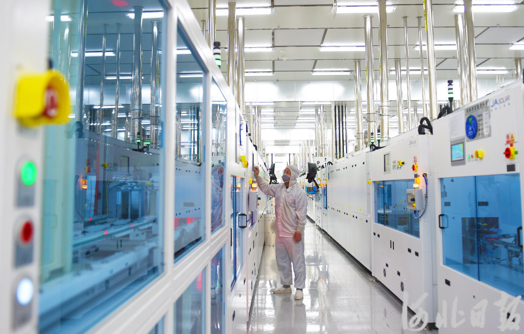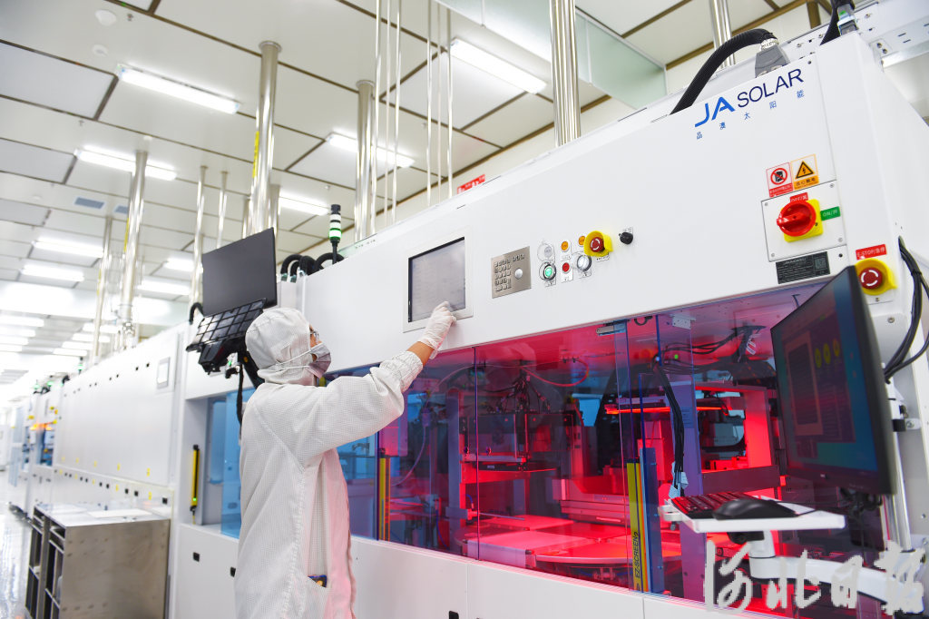 7月15日,工人在宁晋经济开发区晶澳太阳能产业园晶澳6吉瓦N型倍秀电池生产车间巡检。