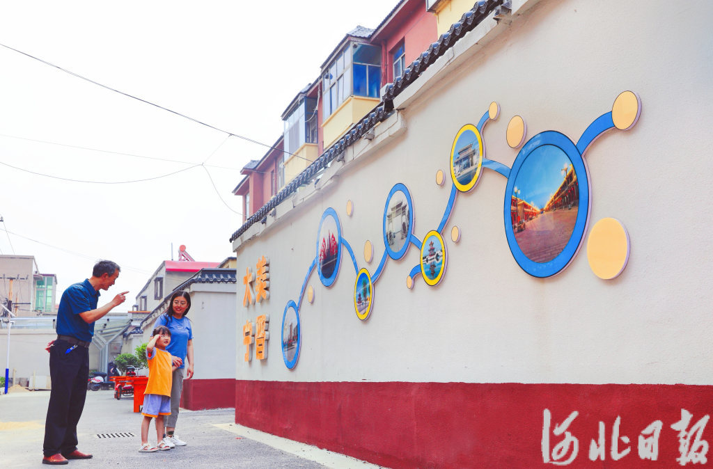 近日,在河北省宁晋县邮电公寓小区文化墙前,老人给孩子讲凤城标志建筑的历史故事。