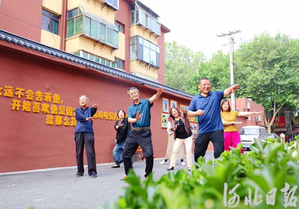 近日,宁晋县邮电公寓小区居民在文化墙前学练健身操。
