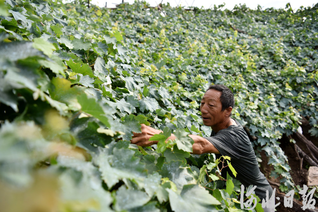 8月6日,张家口市宣化区观后村农民郑春林为葡萄藤打叉。