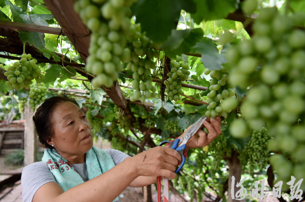 8月6日,张家口市宣化区观后村农民王继枝为葡萄疏果。