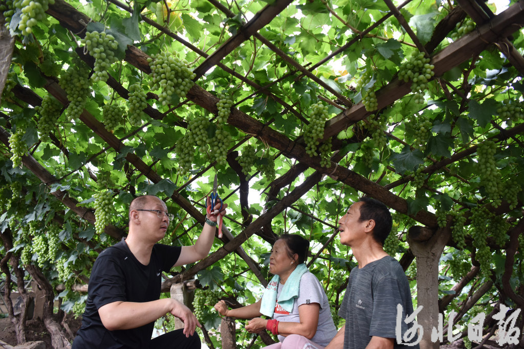 2023年8月6日,河北省张家口市宣化区观后村农业技术员戚辉(左)指导农民管护葡萄。