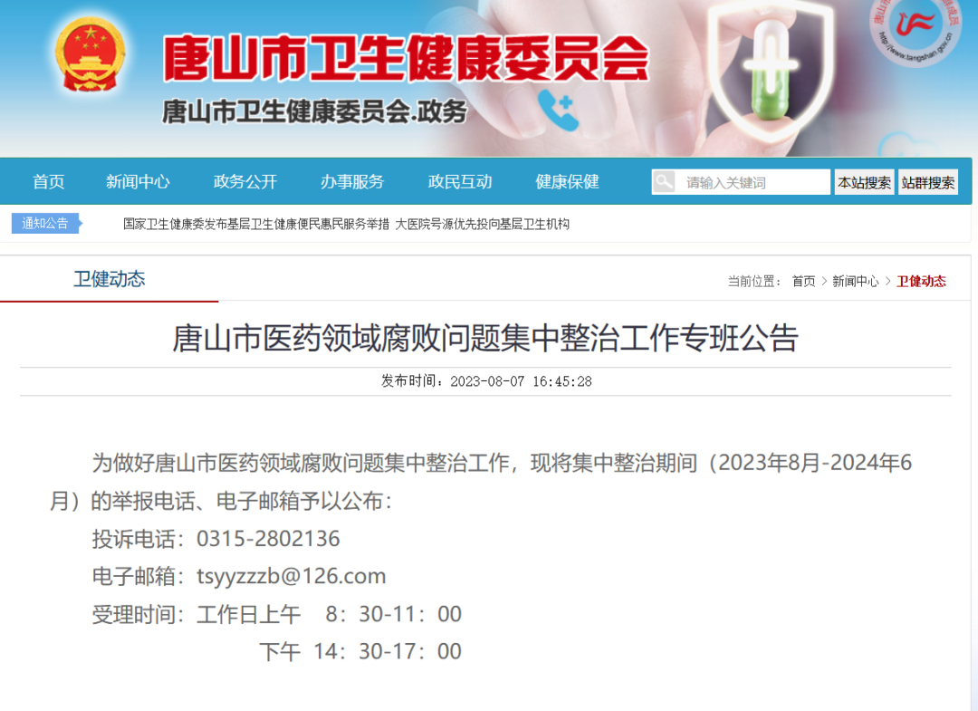 为做好唐山市医药领域腐败问题集中整治工作,现将集中整治期间(2023年8月-2024年6月)的举报电话、电子邮箱予以公布: