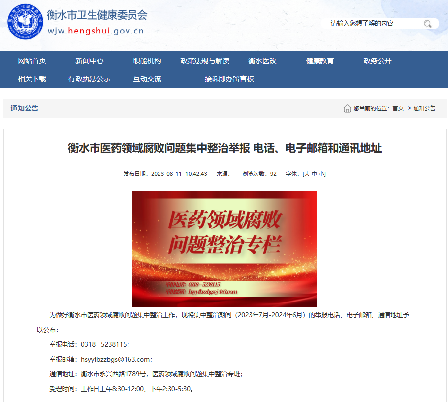 衡水市医药领域腐败问题集中整治举报电话、电子邮箱和通讯地址