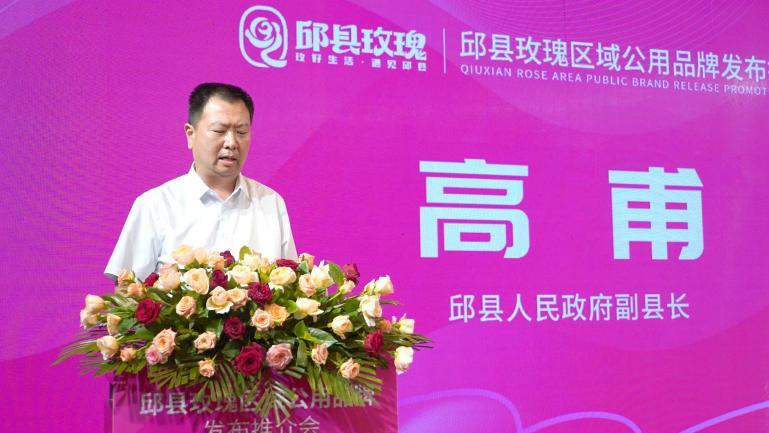 接下来,邱县人民政府副县长高甫上台进行“邱县玫瑰”区域公用品牌产业推介。在推介过程中,他对邱县独有的地理环境优势、品牌优势、品质优势、产业优势、政策优势五大优势做了详细介绍,全面解说了邱县的地方特色产业,介绍了“邱县玫瑰”独有的产业优势和发展前景,积极搭建玫瑰产业的对接渠道,并邀请与会人员深入了解邱县玫瑰产业,期待与社会各界达成深入合作。