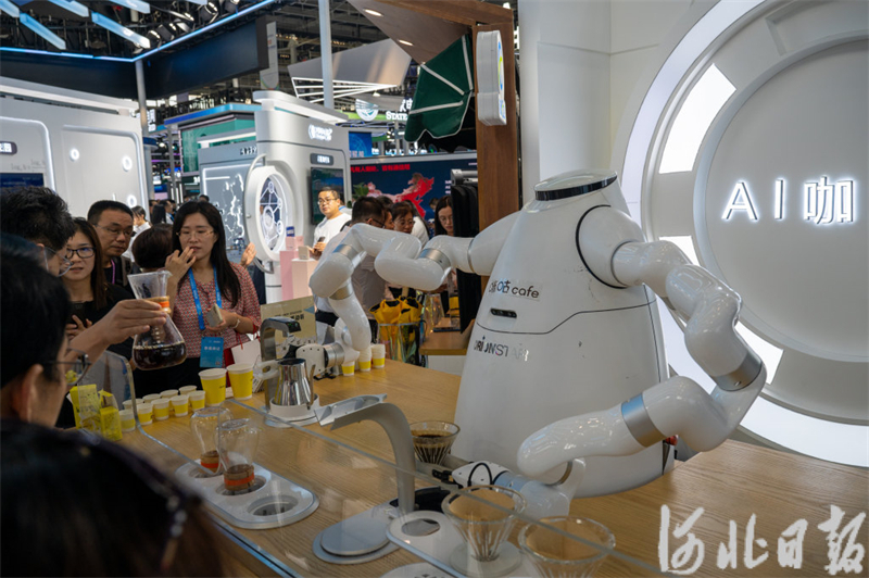 9月6日,石家庄(正定)国际会展中心,观众在参观AI咖啡机器人。