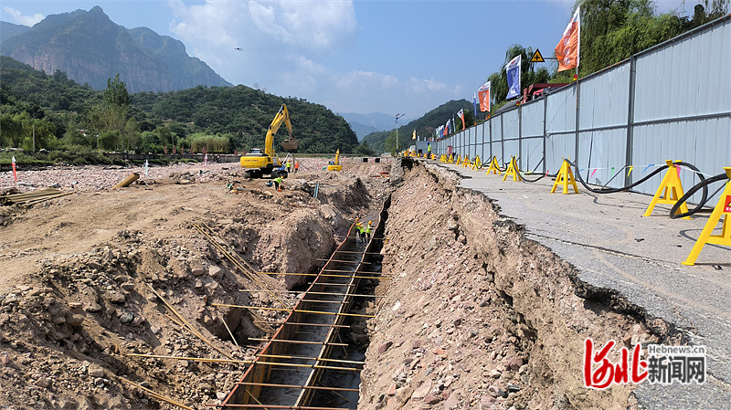 9月13日下午,邢台沙河市纸房村村头一段弯曲的河道旁,原本冲毁的农村公路旧址上,宽敞的道路已经现出雏形。