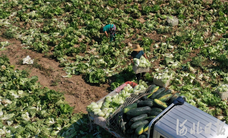 9月21日,石家庄市栾城区南贾村菜农在菜园里采收白菜,准备运往市场销售(无人机照片)。