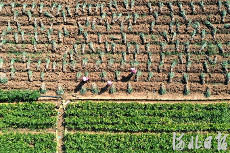 9月21日,石家庄市栾城区赵家庄村农民在大田里收获大葱(无人机照片)。