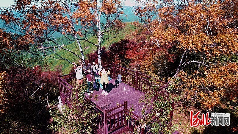 沿一条木栈道登上山顶的观景台,放眼望去,层林尽染,秋色醉人。迎着凉爽山风、赏着多彩山色,欢声笑语不断。
