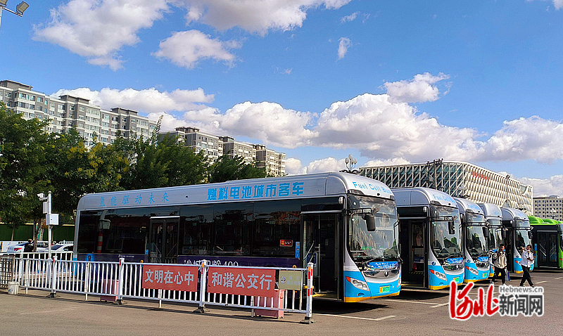 9月30日,在京张高铁张家口站一侧,氢燃料电池公交车整装待发。 河北日报记者曹智摄
