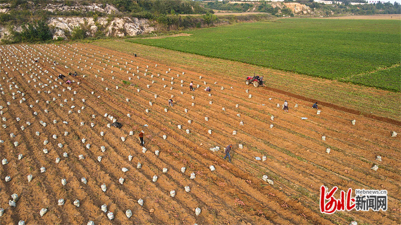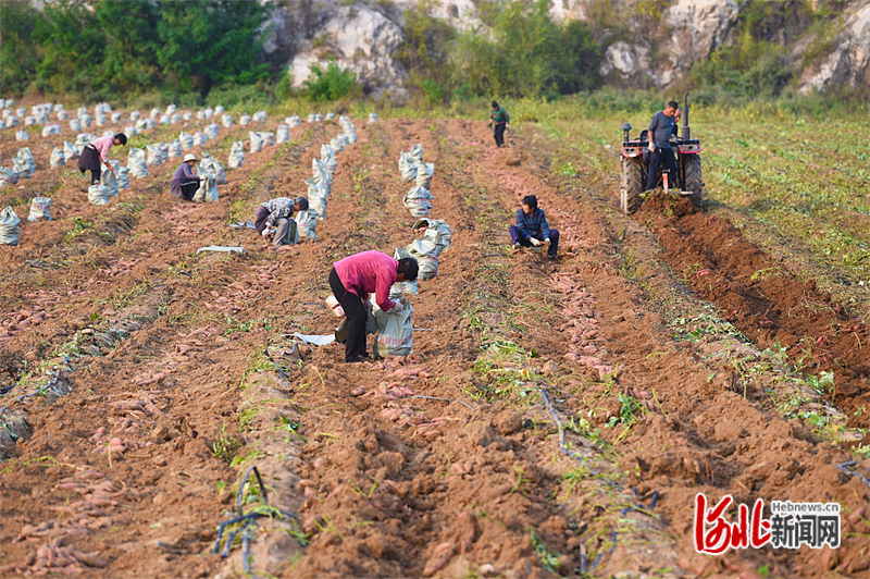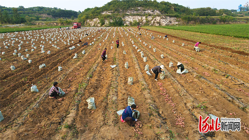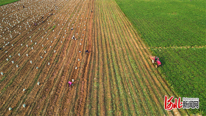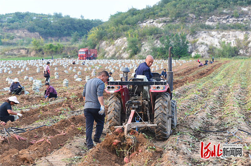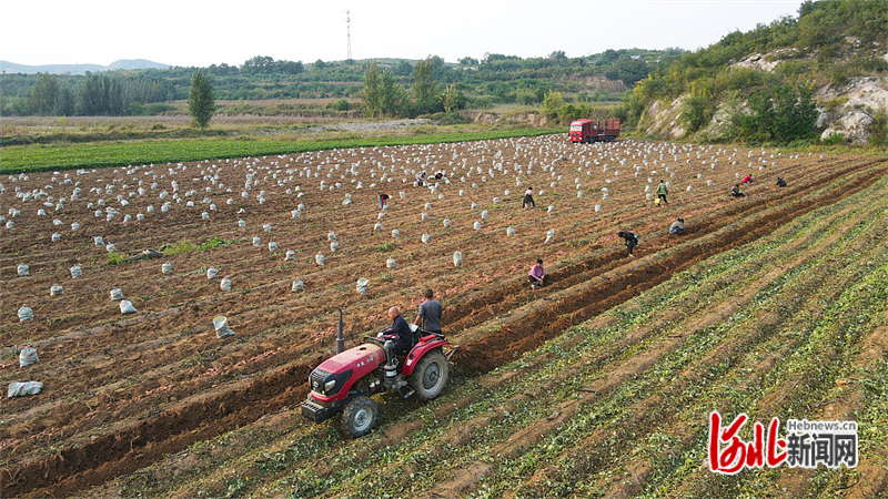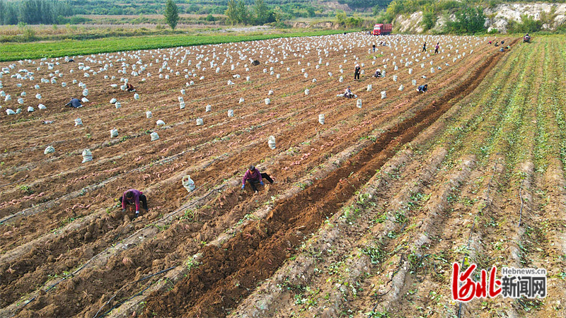 10月7日,农民在临城县临城镇澄底村稼兴家庭农场红薯种植基地收获蜜薯。