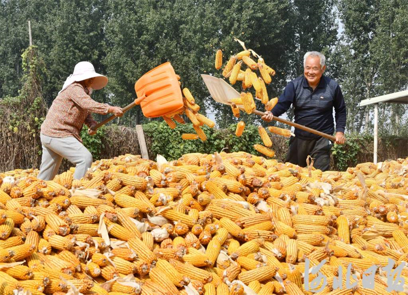 10月8日,邯郸市永年区东杨庄镇前马营村农民在晾晒收获的玉米。