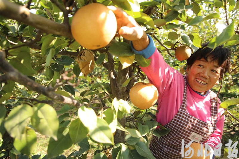 10月9日,在广平县平固店镇南下堡村晚秋黄梨种植基地,农民在采摘晚秋黄梨。