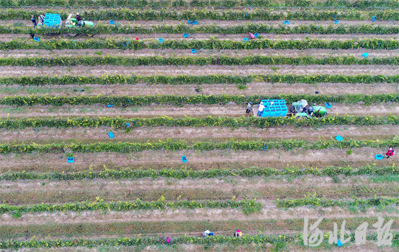 10月9日,农民在怀来县长城桑干葡萄酒庄采摘酿酒葡萄。