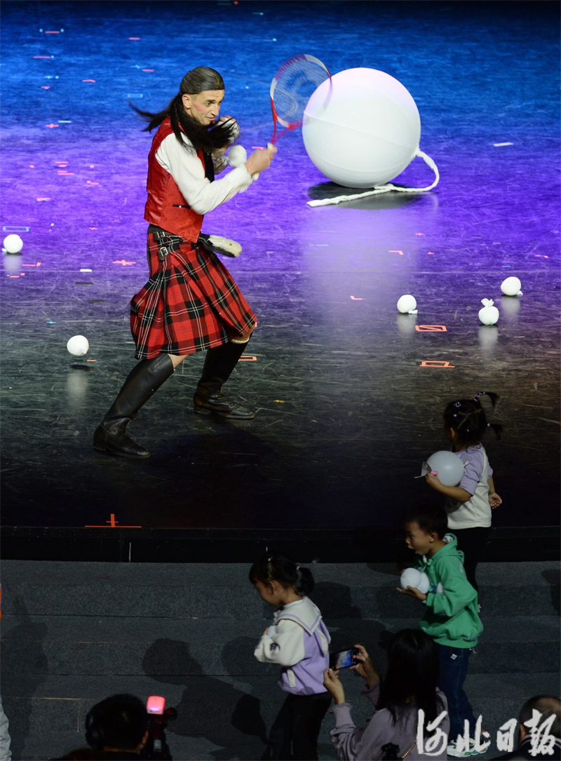 10月23日,第十九届中国吴桥国际杂技艺术节B场演出,法国滑稽演员与现场观众互动。