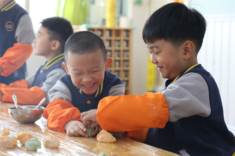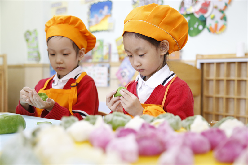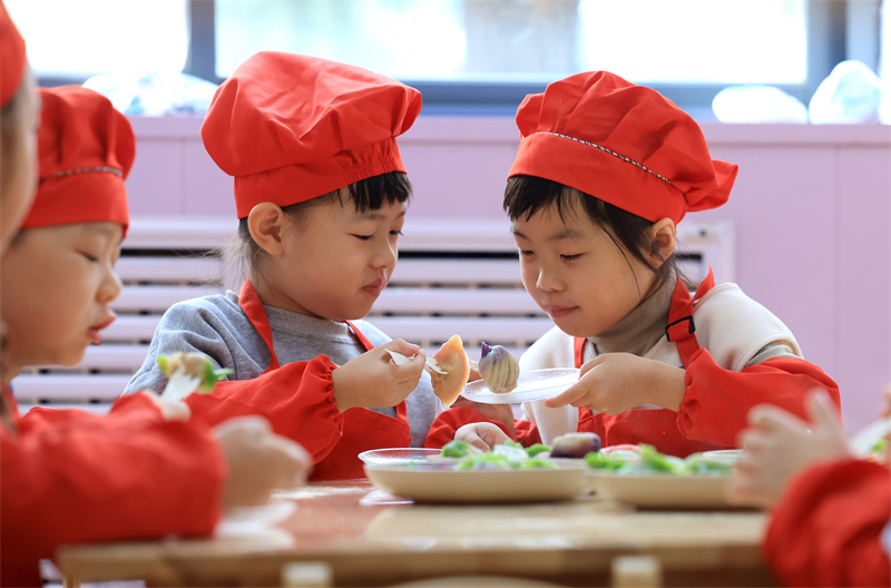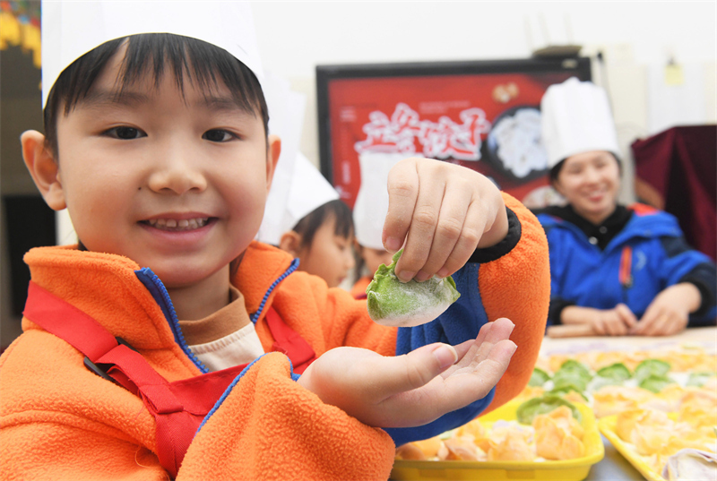 11月8日迎来立冬节气。多地幼儿园开展包饺子活动,小朋友在老师的指导下学习包饺子、煮饺子,体验传统民俗文化。新华社发(张驰 摄)