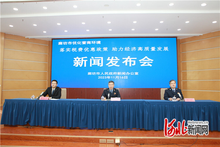 11月16日,廊坊市政府新闻办召开“落实税费优惠政策助力经济高质量发展”新闻发布会。图为新闻发布会现场。