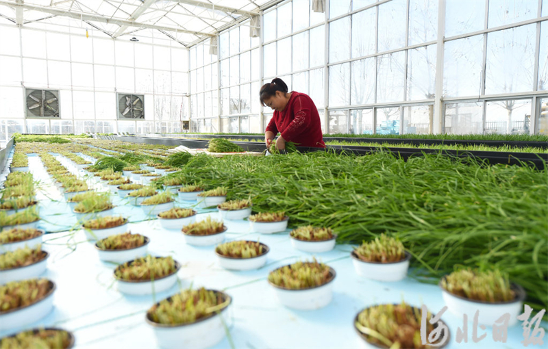 11月30日,永清县兴晟农业研究院“鱼菜共生”循环养殖基地工作人员在采收无土栽培韭菜。