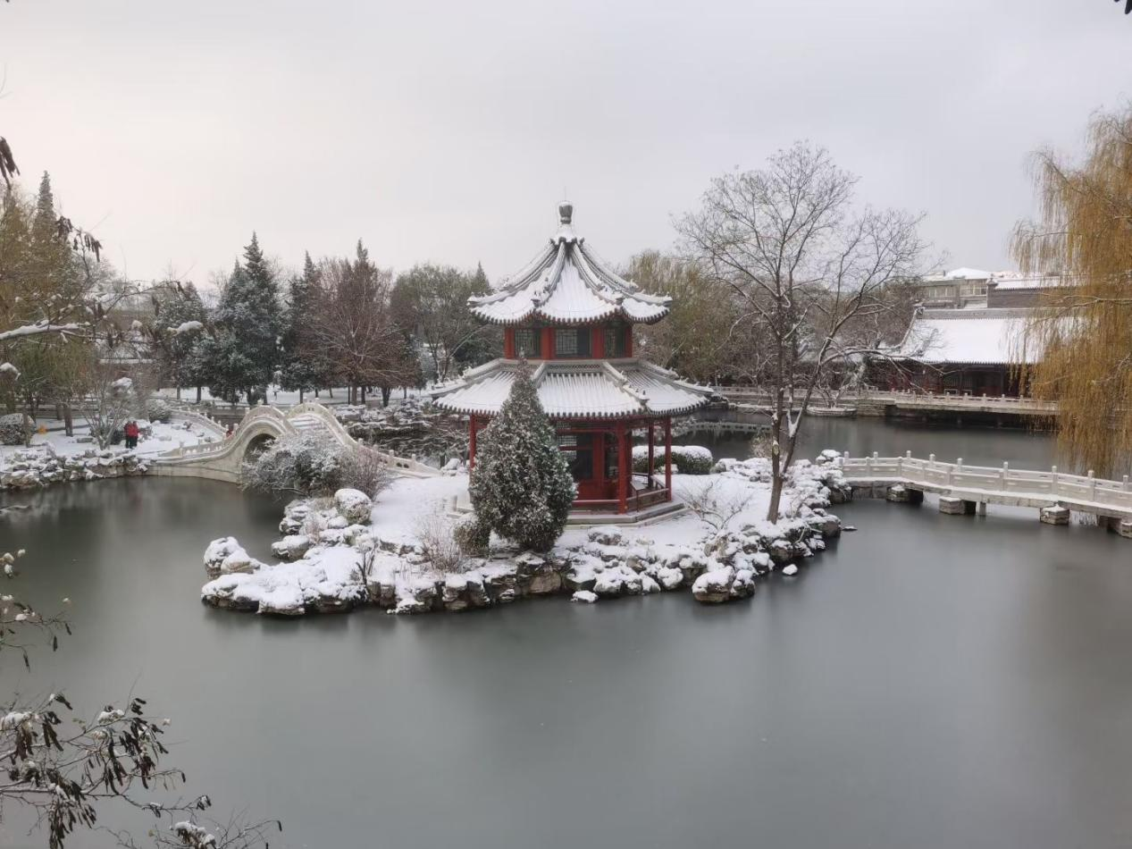 图1:12月10日傍晚,保定市迎来今年冬天的初雪。古莲花池也被白雪覆盖,进入银色世界。红墙灰瓦,画栋雕梁,在漫天飞舞的雪花下,尽显诗意。(本版图片由柴汝新12月11日拍摄)