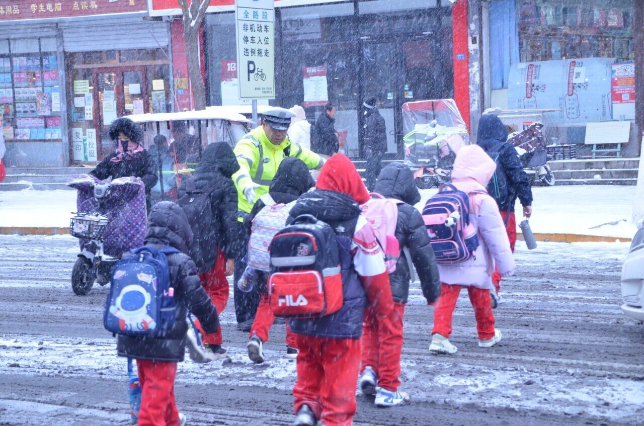 12月11日降雪期间,廊坊市交警在学校路口指挥疏导交通。 河北日报通讯员陈海生摄