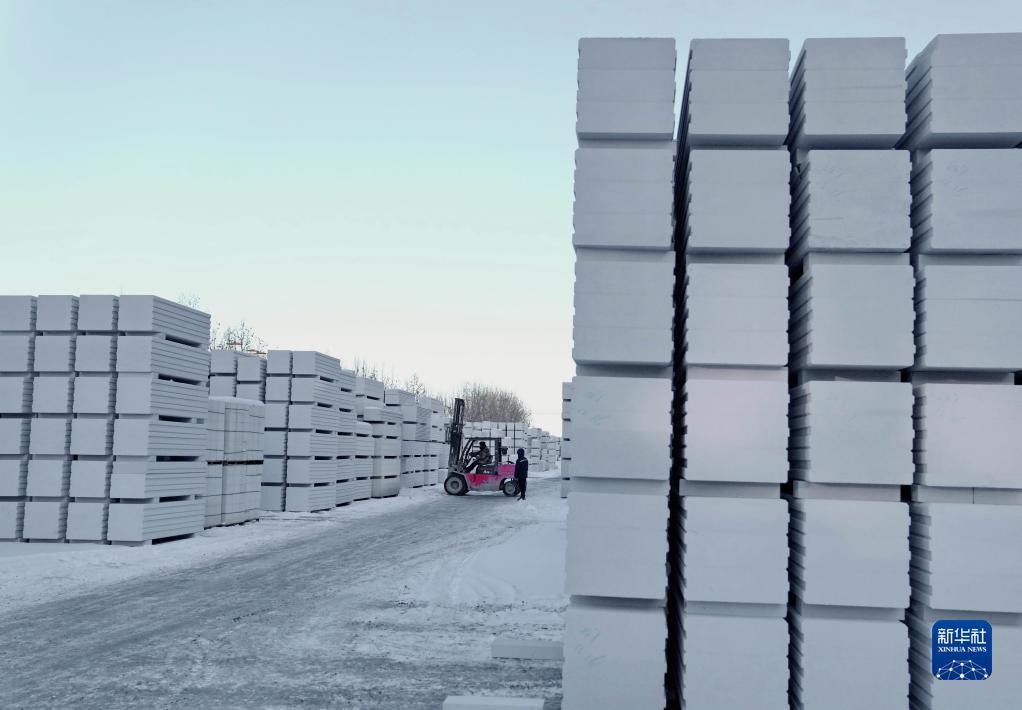 12月17日,工人在河北省滦州市一家新型环保建筑材料企业的产品堆场工作。