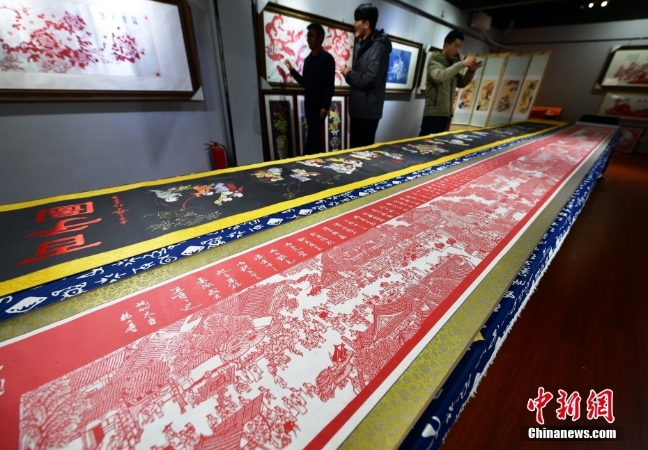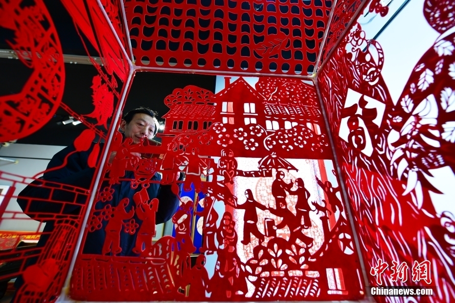 12月28日,河北省衡水市阜城县一家剪纸工作室,参观者观看剪纸作品《老家》。据了解,阜城剪纸至今已有200多年历史,2016年被列入河北省省级非物质文化遗产名录。该技艺具有阴阳相间、线条流畅、色彩单纯、形象鲜明、刀工巧妙等艺术风格,它以传统的中国绘画为基础,材料有丝绸、布匹、绢纸、宣纸等。如今,阜城剪纸作品不仅畅销北京、天津、东北三省,还远销新加坡、韩国等28个国家和地区。中新社记者 翟羽佳 摄