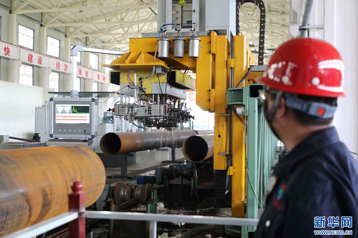在河北海乾威钢管有限公司车间内的全智能化生产流水线上,工人们正在生产1万吨的大口径直缝埋弧焊钢管。据了解,这是一条大口径、高钢级直缝埋弧焊钢管生产线,钢管主要用于石油天然气的输送。工作人员可以通过电脑、手机APP,实时监测生产质量和进度。