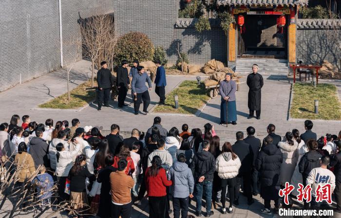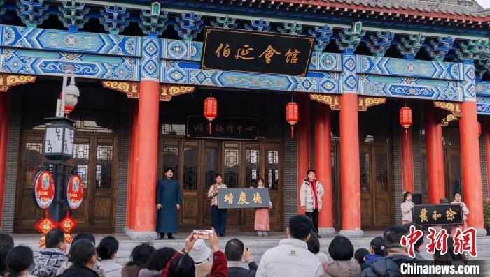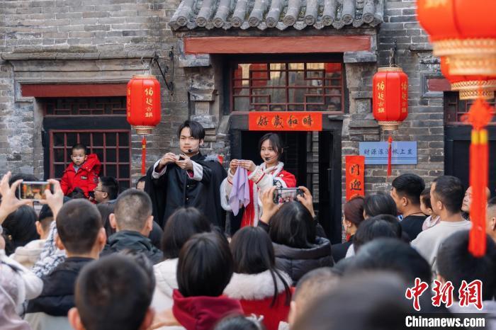 2月14日,武安市伯延古镇《商帮归来》演出现场,游客观看武安商帮举办婚礼的场景。安晓亮 摄