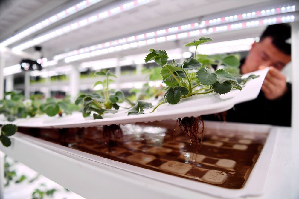 ↑3月8日,馆陶县一家现代农业示范园区的工作人员在智能温室内查看水培草莓生长情况。