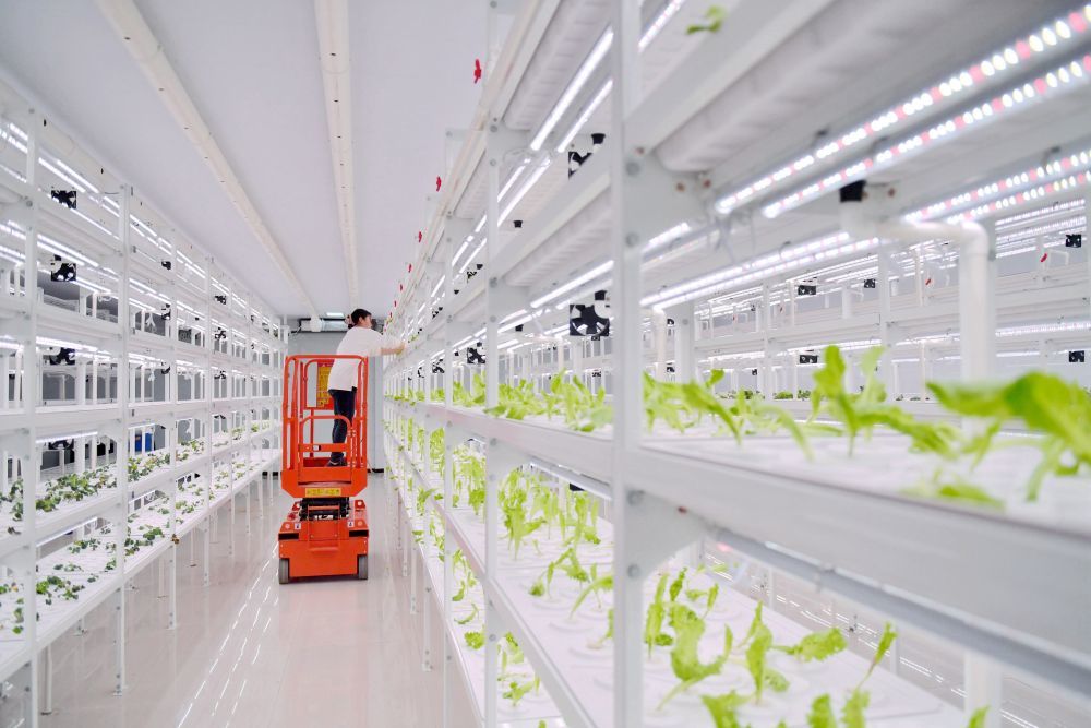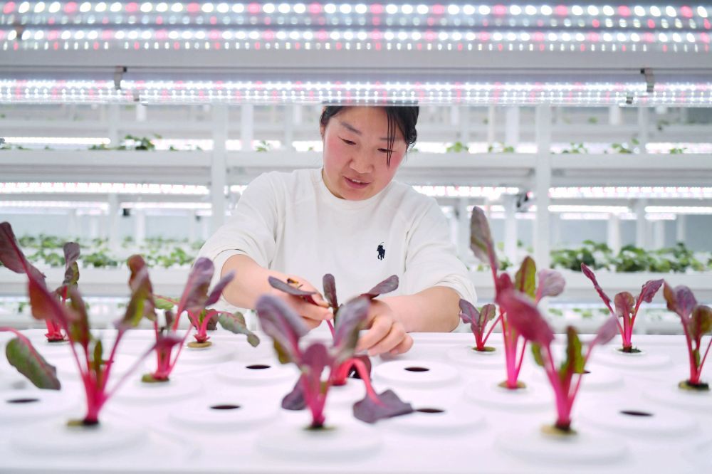 ↑3月8日,馆陶县一家现代农业示范园区的工作人员在智能温室内查看水培蔬菜生长情况。