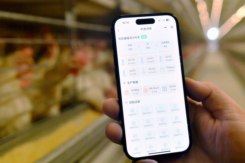 ↑3月8日,在馆陶县一家智慧蛋鸡养殖产业示范园,工作人员通过移动端查看信息。
