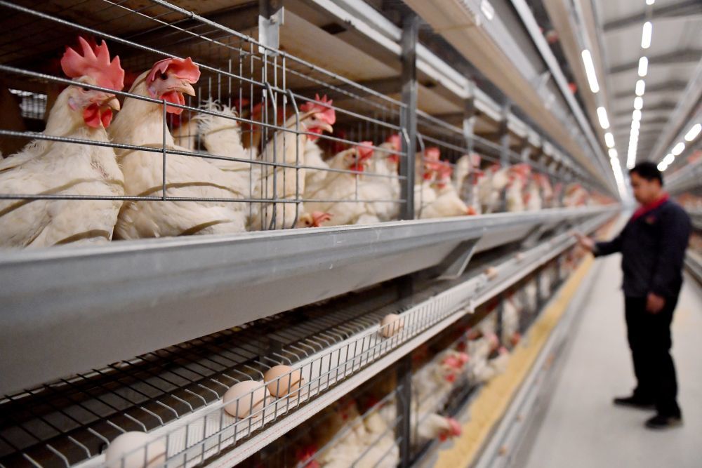 ↑3月8日,在馆陶县一家智慧蛋鸡养殖产业示范园,工作人员查看自动化蛋鸡笼养设备运行情况。