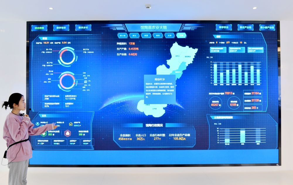 ↑3月8日,在馆陶县现代农业产业园农业农村大数据中心,工作人员在介绍“农业大脑”系统。
