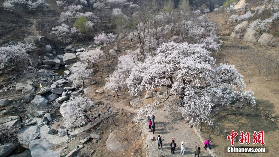 3月18日,游人踏青赏杏花。近日,河北省石家庄市赞皇县十里杏花谷景区的杏花竞相绽放,花香四溢,吸引游客前来踏青赏花。(无人机照片)中新社记者 翟羽佳 摄