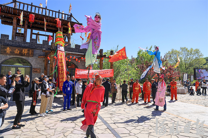 2024年5月1日,游客在唐山市迁西县青山关景区观看非物质文化遗产背杆表演。