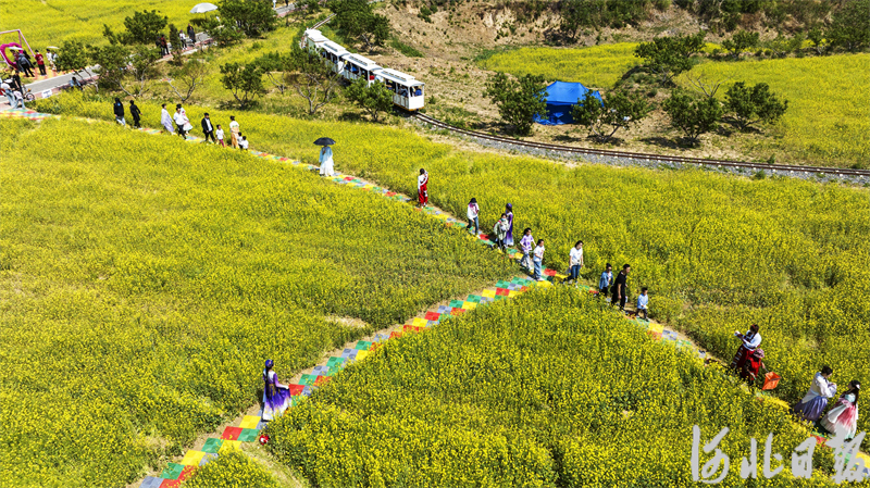 2024年5月2日,河北省邯郸市复兴区二六七二街道“河北省美丽乡村”东高河村,1000多亩油菜花竞相绽放。美丽如画的乡村美景吸引游客游览打卡拍照留念。
