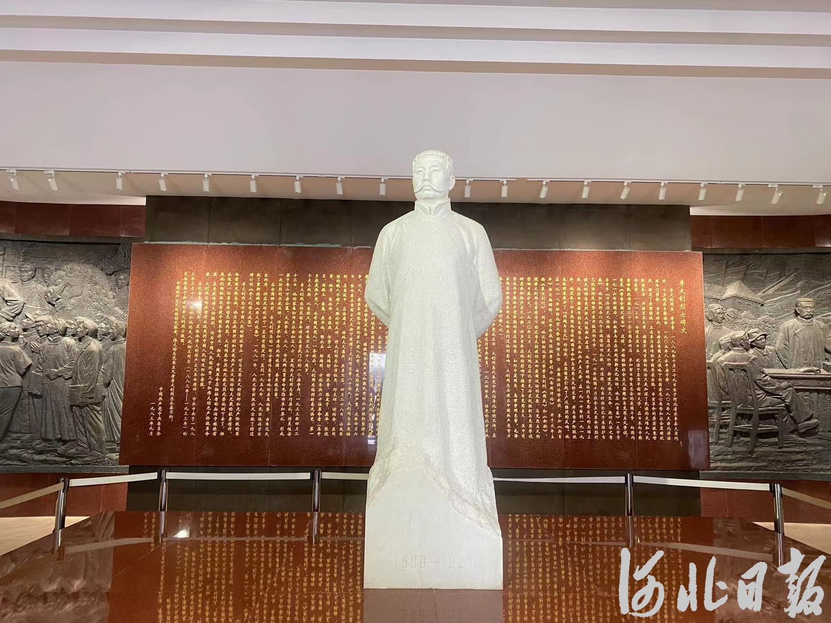 乐亭县李大钊纪念馆瞻仰大厅内的李大钊立式汉白玉雕像。河北日报记者常方圆摄