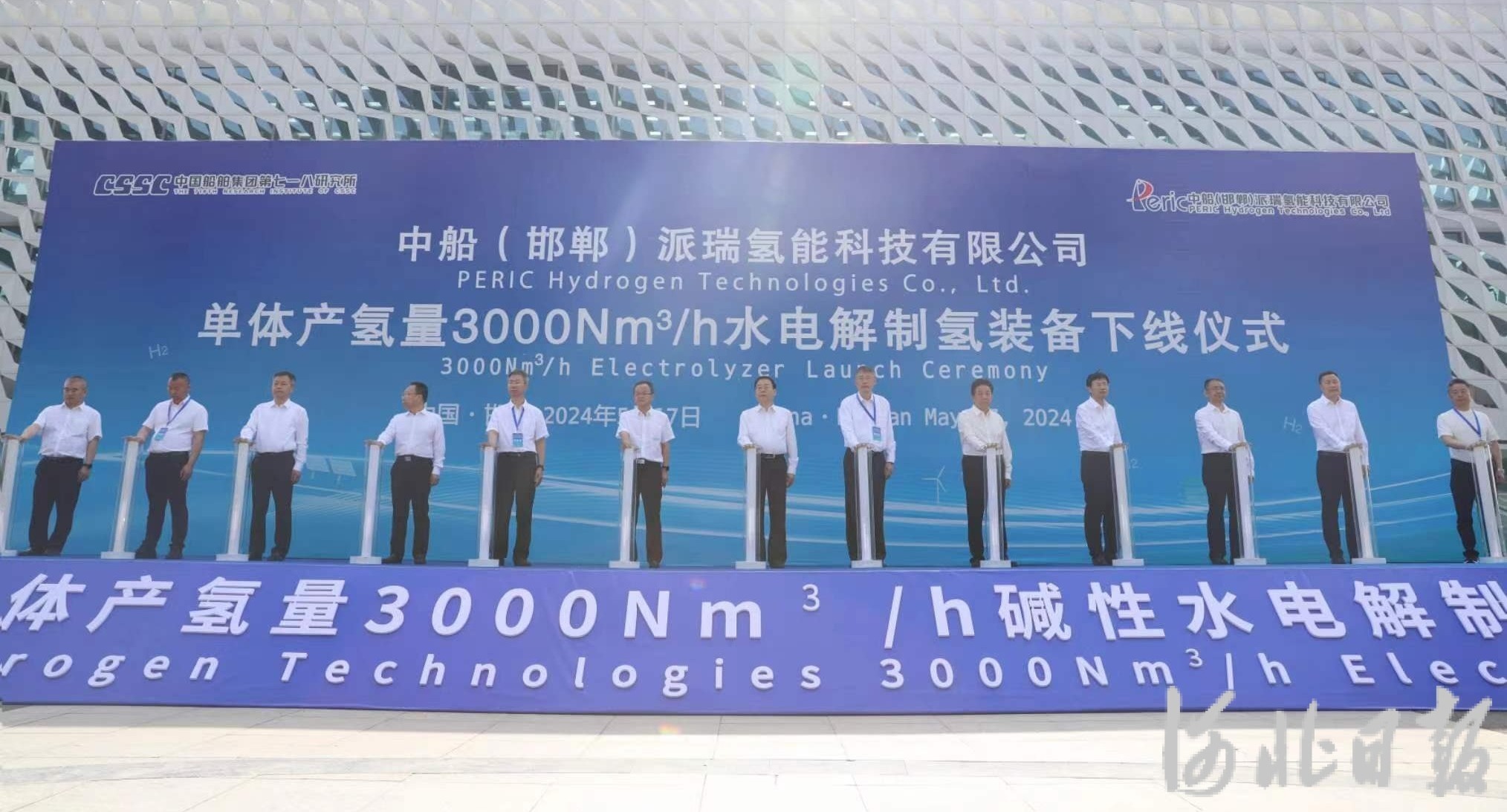 5月17日,中船(邯郸)派瑞氢能科技有限公司举办单体产氢量3000Nm³/h水电解制氢装备下线仪式。河北日报通讯员黄泽龙摄