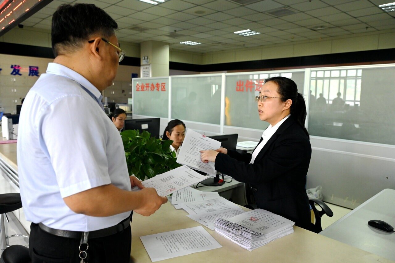 “潘总,按‘证照联变’办事流程,您把材料交给我们,然后就等着拿证吧。”窗口工作人员王霞接过材料热情地说。文件扫描、审核材料、录入信息……窗口内,几名工作人员开始忙碌起来。