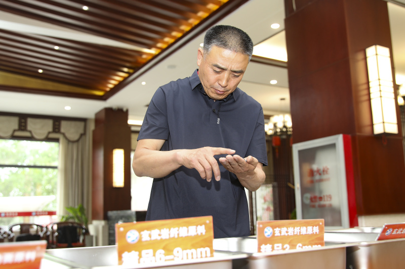 6月5日,蔚县新源玄武岩矿业有限公司负责人朱兆春在办公大厅玄武岩纤维原料展示区工作。武殿森 摄