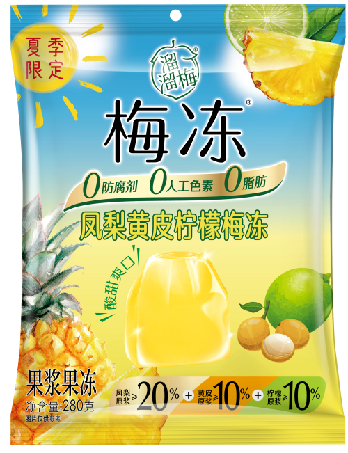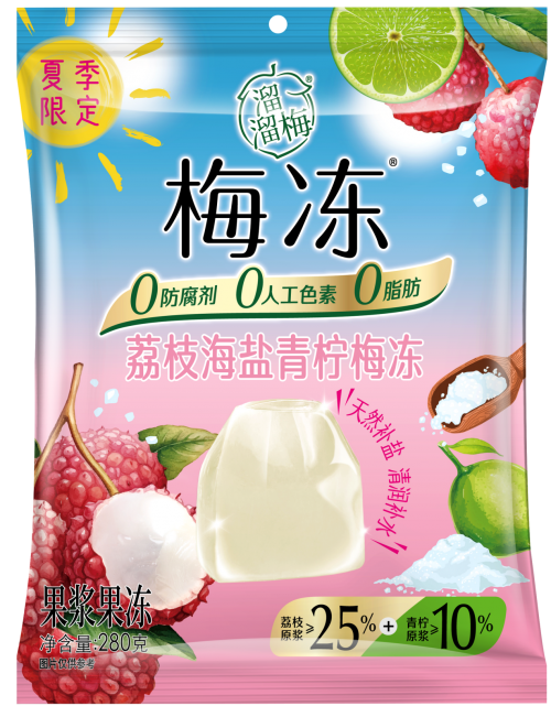 当然,溜溜梅也深谙“清凉商品”在夏日的刚需性,特别推出了梅冻夏季限定系列新品——凤梨黄皮柠檬梅冻、荔枝海盐青柠梅冻。两款新品依然延续了梅冻的天然健康属性,采用蒟蒻和来自地中海的刺槐豆胶为原料,并坚持0防腐剂、0人工色素、0脂肪。同时,新品梅冻还甄选全球天然食材,凤梨黄皮柠檬梅冻添加了≥10%的尤力克柠檬原浆、≥20%的鲜榨海南凤梨原浆、≥10%的鲜榨海南黄皮原浆,清新酸爽,生津消暑;荔枝海盐青柠梅冻添加了≥25%的鲜榨岭南荔枝原浆、≥10%的青柠原浆以及来自澳洲纯净海域的天然海盐,不仅果香浓郁、咸甜适口,还有助于为身体补充矿物质和所需盐分。